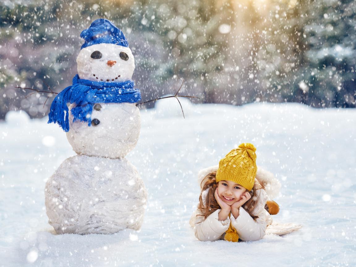 Wallpaper A cute girl lies in the snow by a snowman in winter