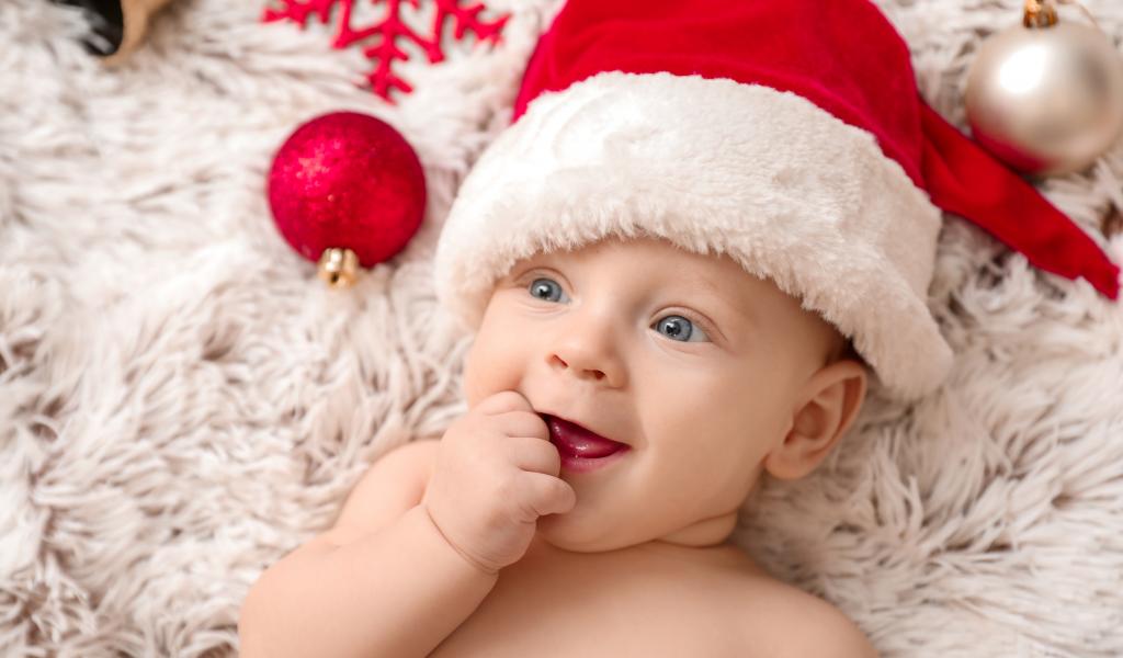 Wallpaper Blue-eyed baby in a red Santa Claus hat