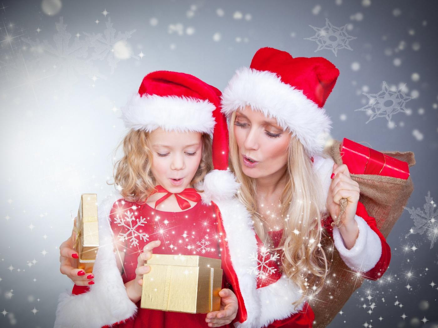 Wallpaper Little girl with mom in Christmas costumes with gifts