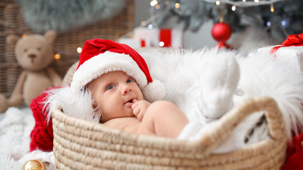 Wallpaper Cute baby in a Santa Claus hat lies in a basket