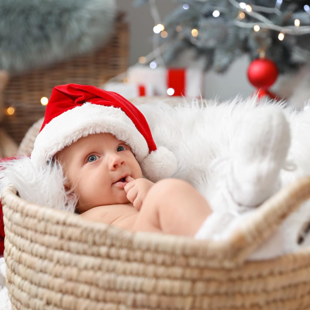 Wallpaper Cute baby in a Santa Claus hat lies in a basket