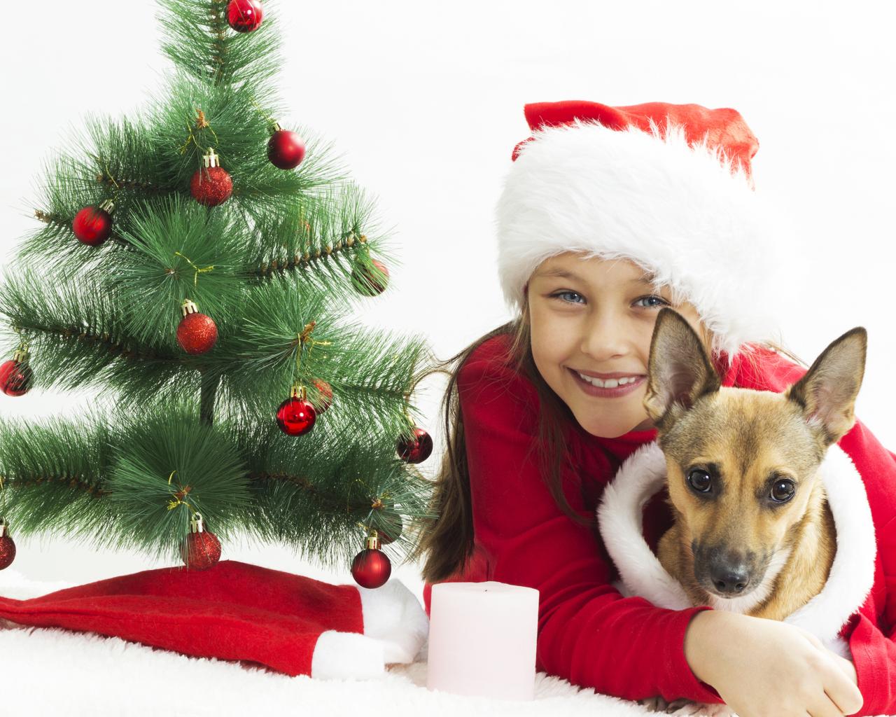 Wallpaper Smiling girl with dog near green christmas tree