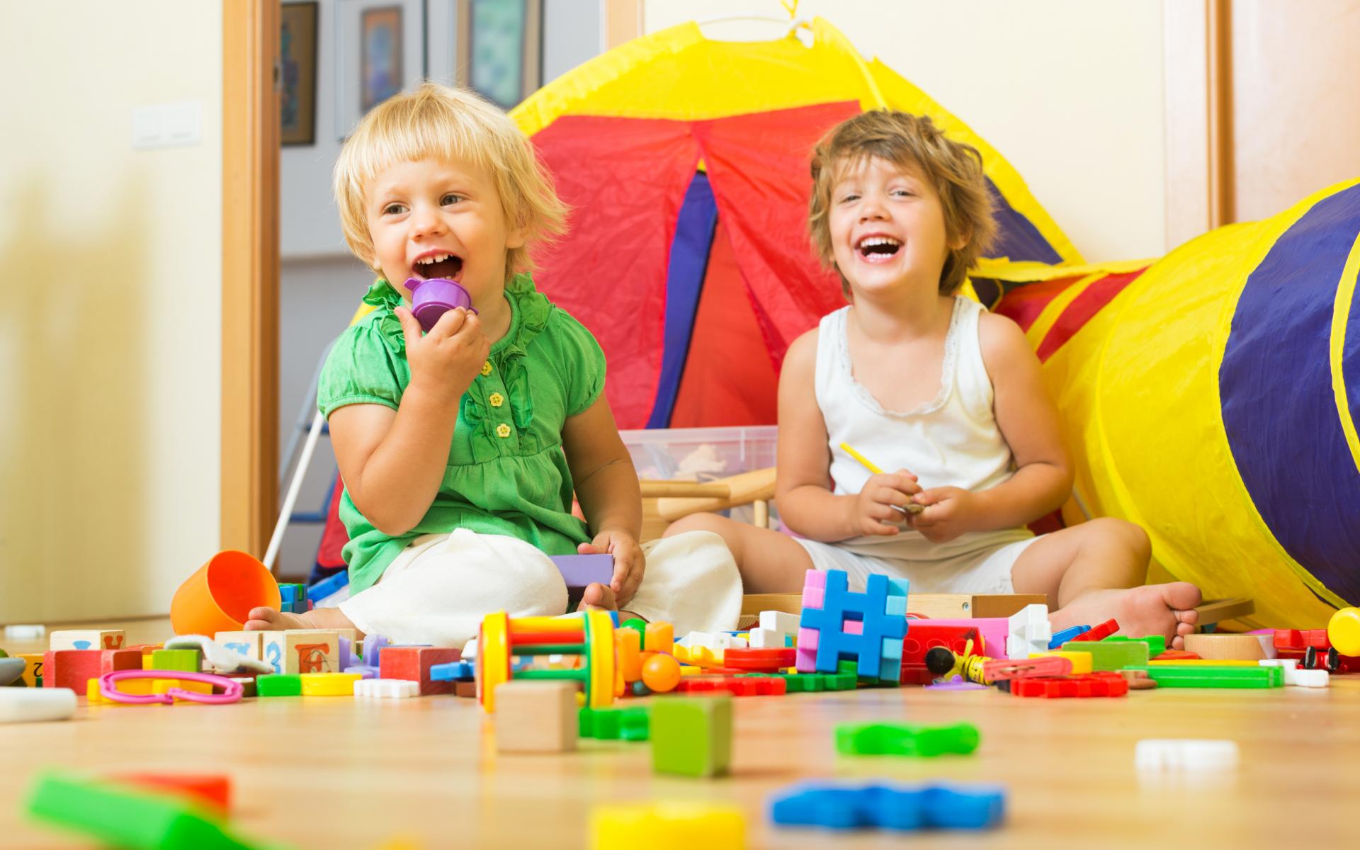 Wallpaper Two smiling children playing with a constructor
