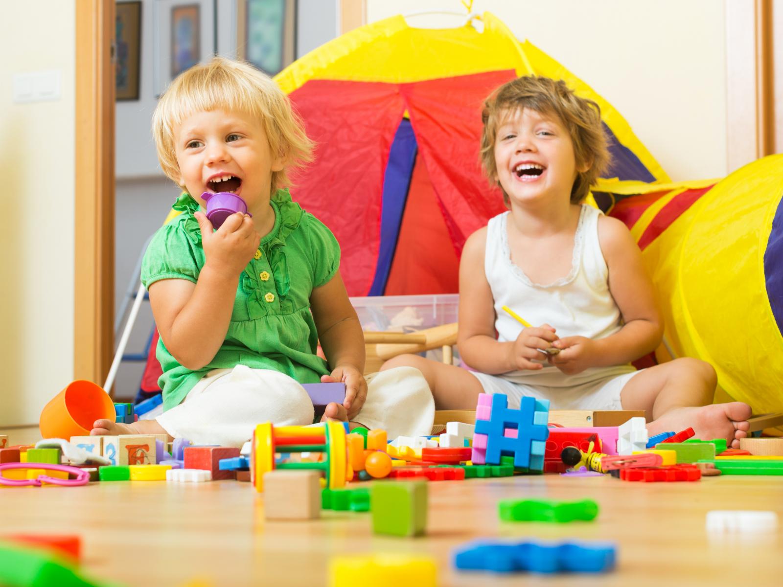 Wallpaper Two smiling children playing with a constructor