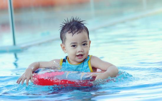 Wallpaper Little child with lifebuoy in the pool