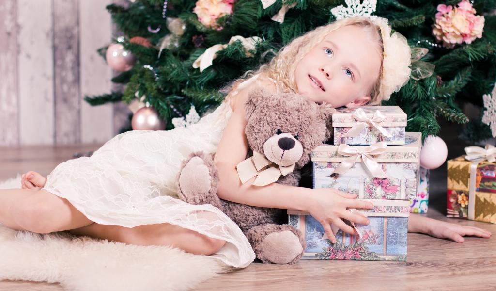 Wallpaper Beautiful blue-eyed girl with gifts by the Christmas tree