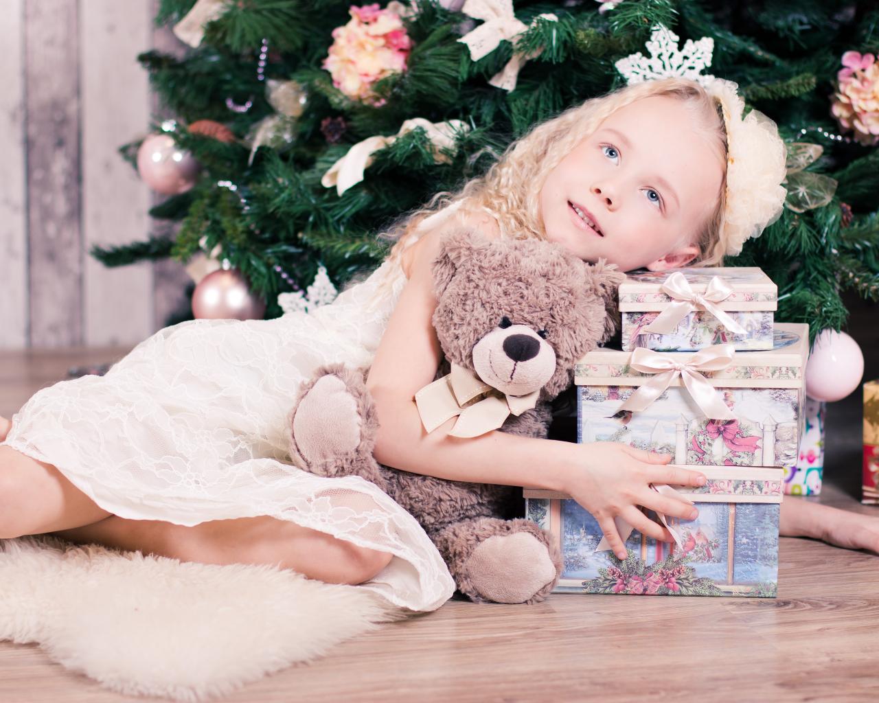 Wallpaper Beautiful blue-eyed girl with gifts by the Christmas tree