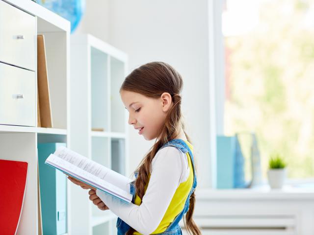Wallpaper Smart girl schoolgirl reading a book in the library
