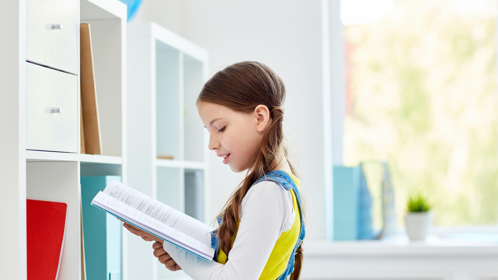 Wallpaper Smart girl schoolgirl reading a book in the library