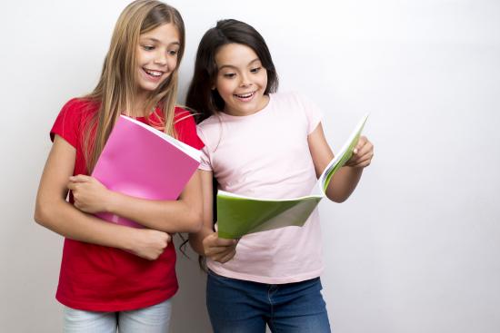 Wallpaper Two little girls schoolgirls with exercise books