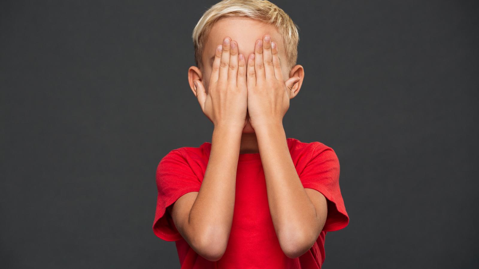 Wallpaper Little boy in a red t-shirt covered his face with his hands