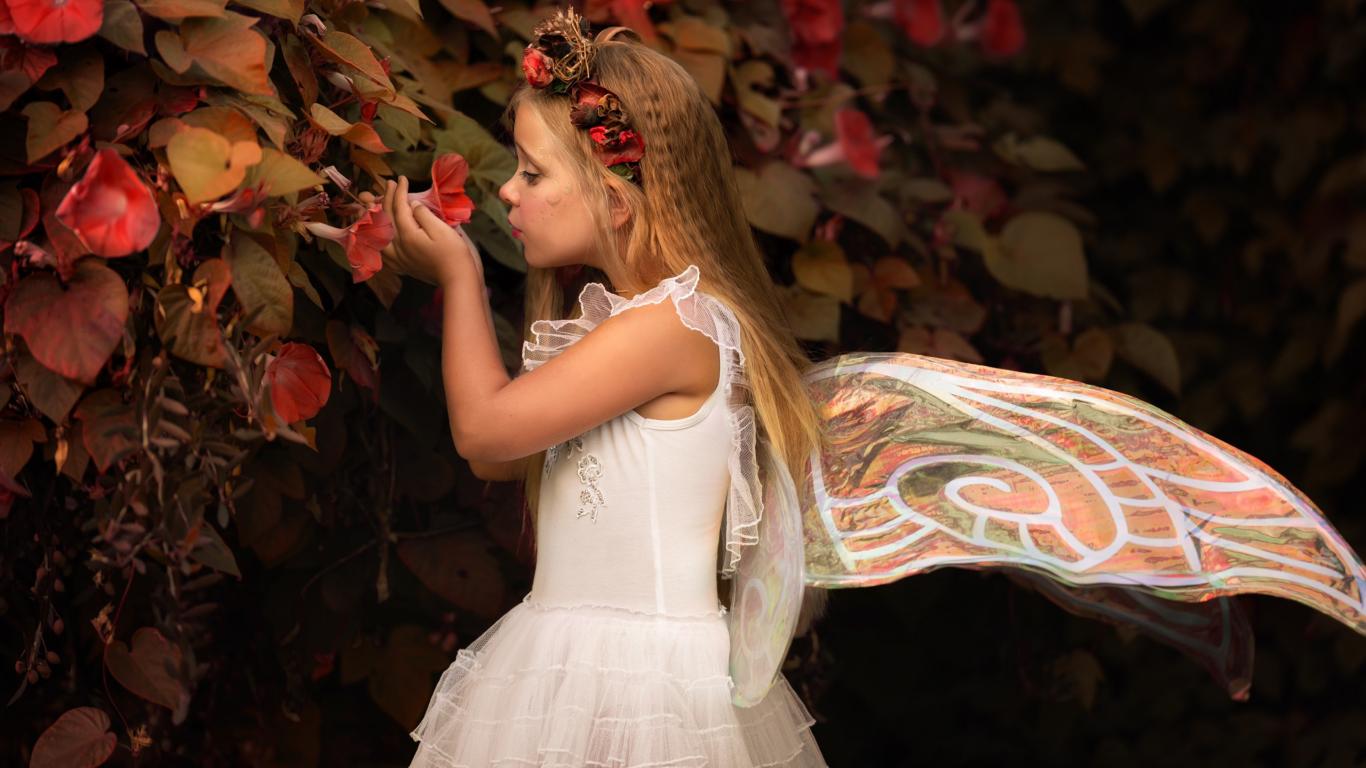 Wallpaper Little girl dressed as a fairy stands by the flowers