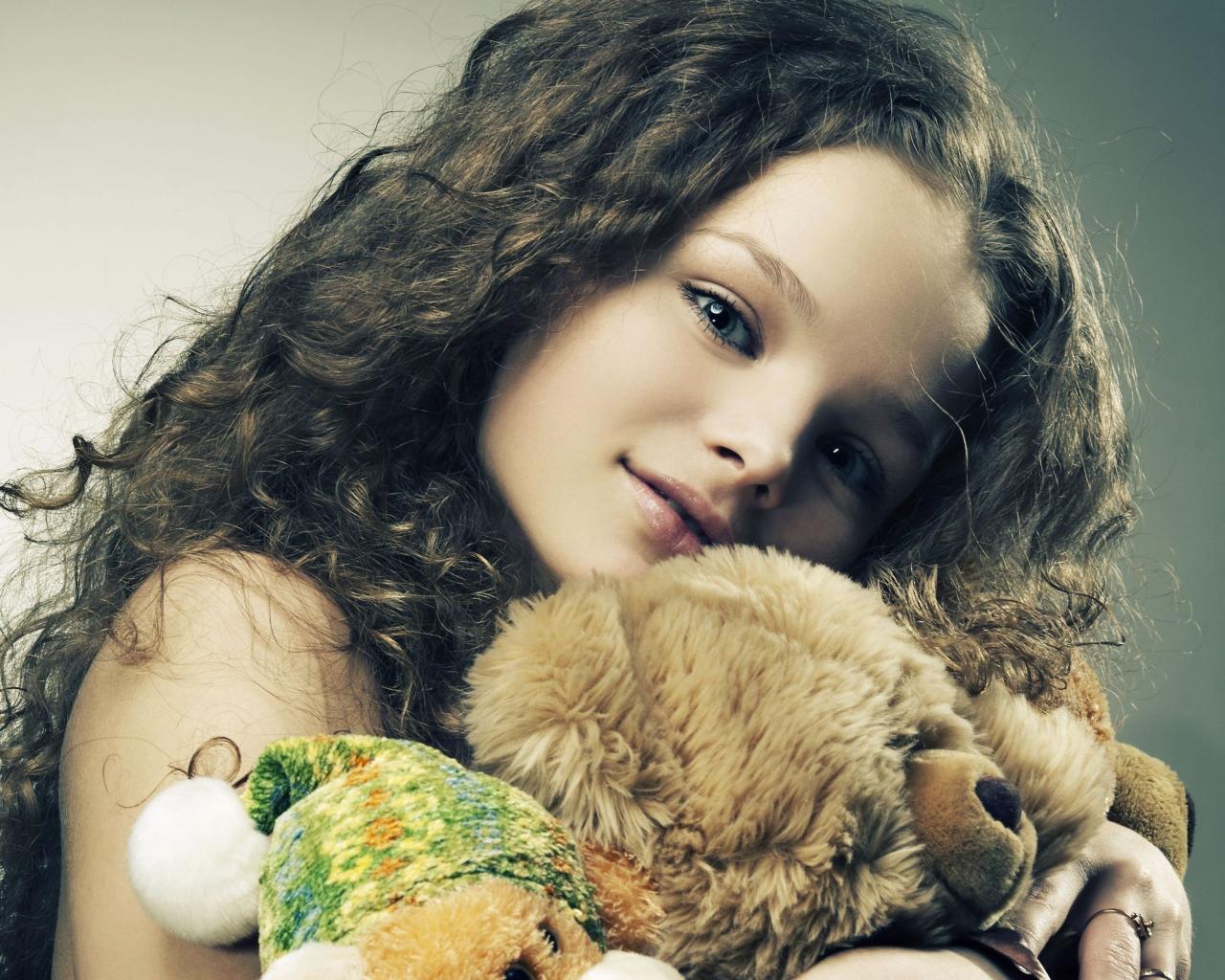 Wallpaper Beautiful girl with long hair with a bear in her arms