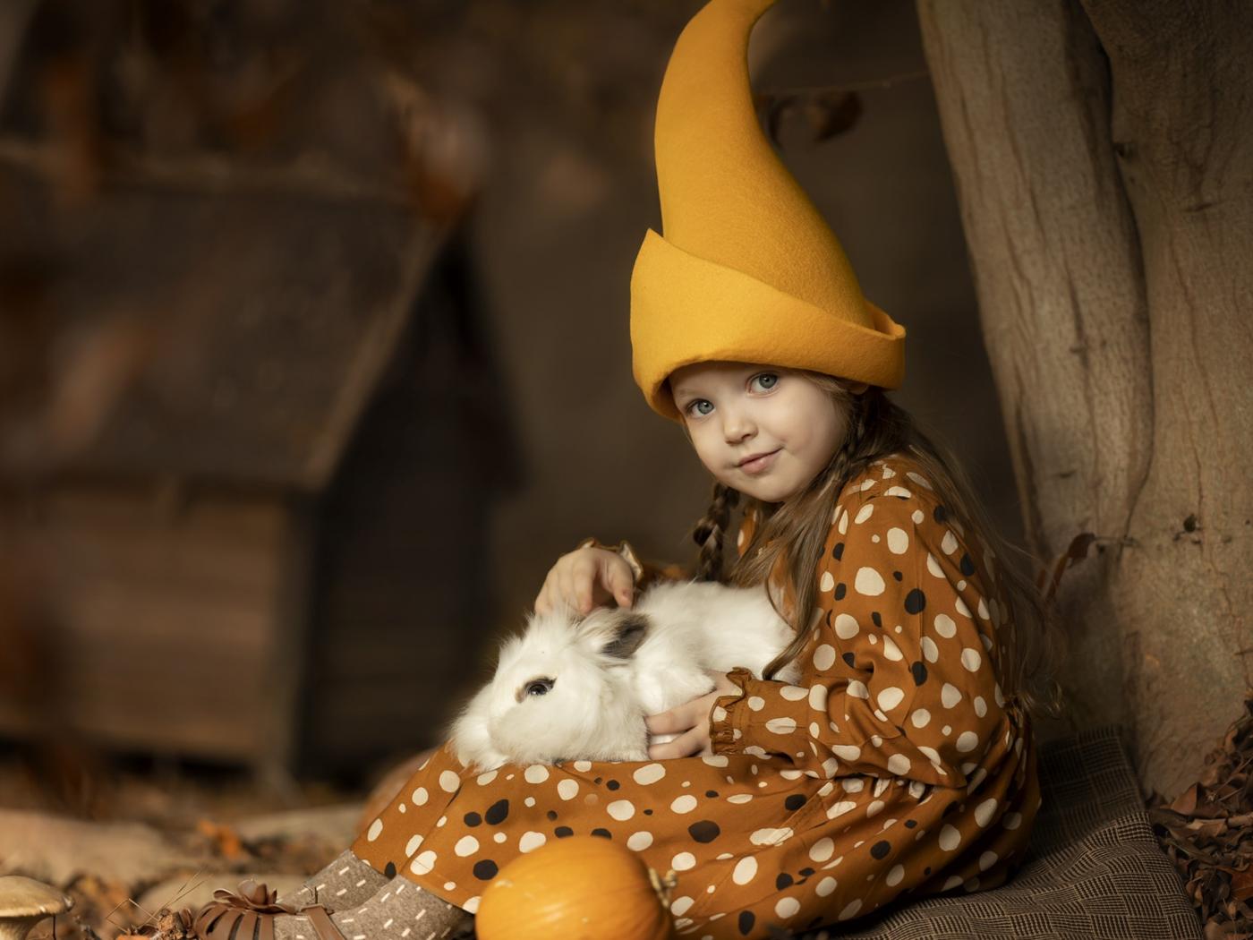 Wallpaper Little funny girl in a cap with a rabbit