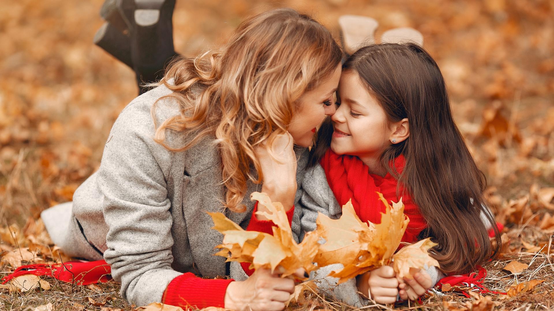 Wallpaper Mom and daughter lie on the foliage in the fall
