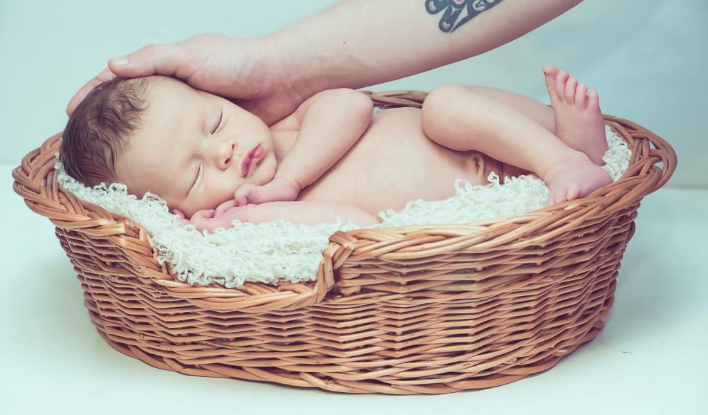 Wallpaper Sleeping nursing baby in basket on gray background