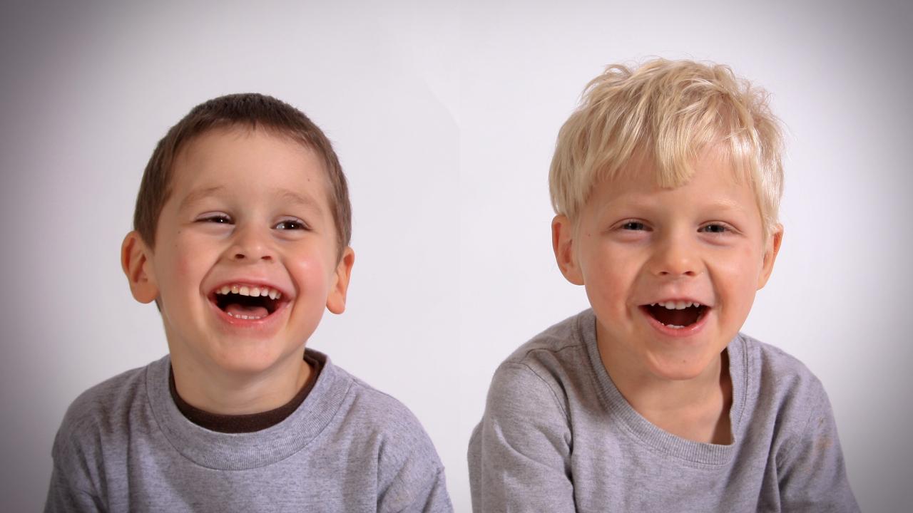 Wallpaper Two little boys laughing on gray background