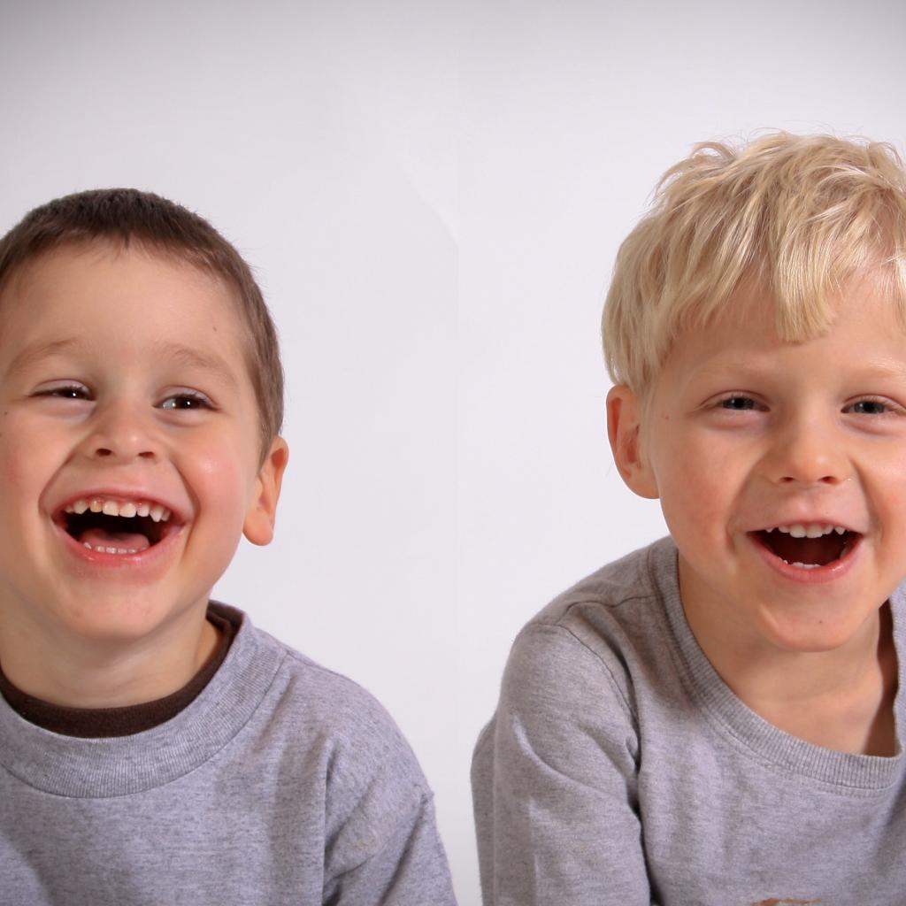 Wallpaper Two little boys laughing on gray background