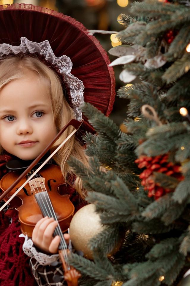 Wallpaper Beautiful little girl with a violin near the fir