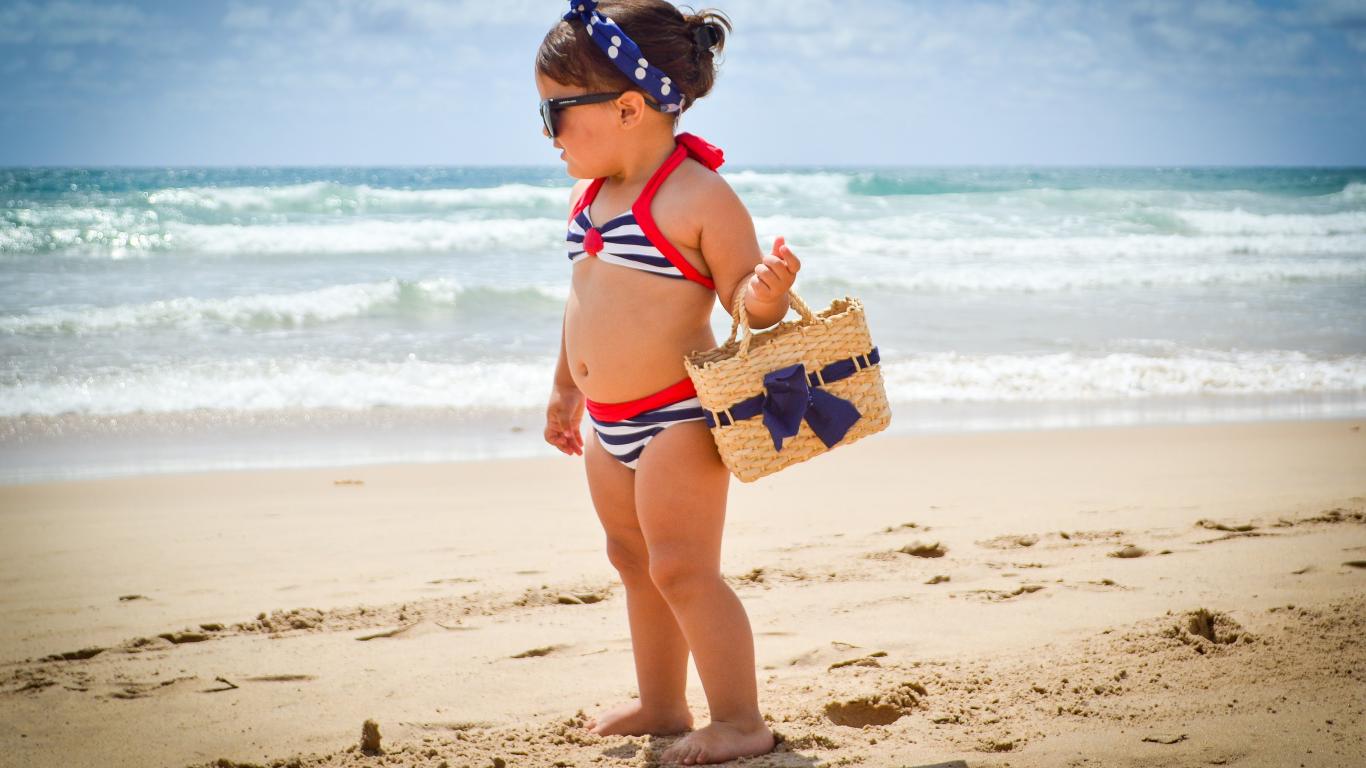 Wallpaper A little girl in a swimsuit walks on the beach