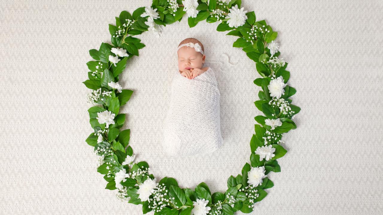 Wallpaper Small nursing baby sleeping in a green wreath of leaves