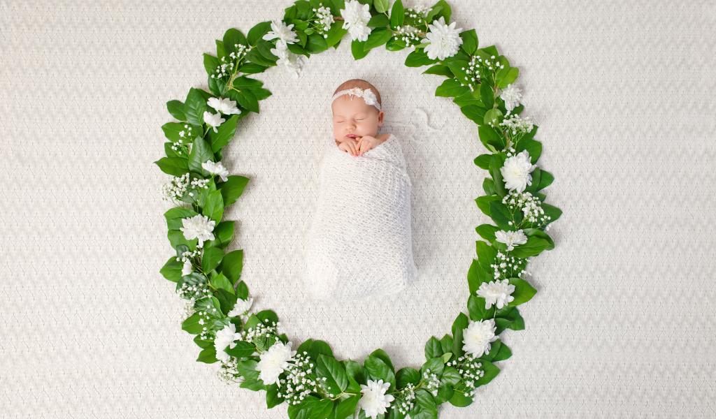 Wallpaper Small nursing baby sleeping in a green wreath of leaves