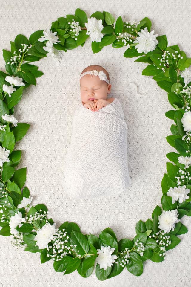 Wallpaper Small nursing baby sleeping in a green wreath of leaves