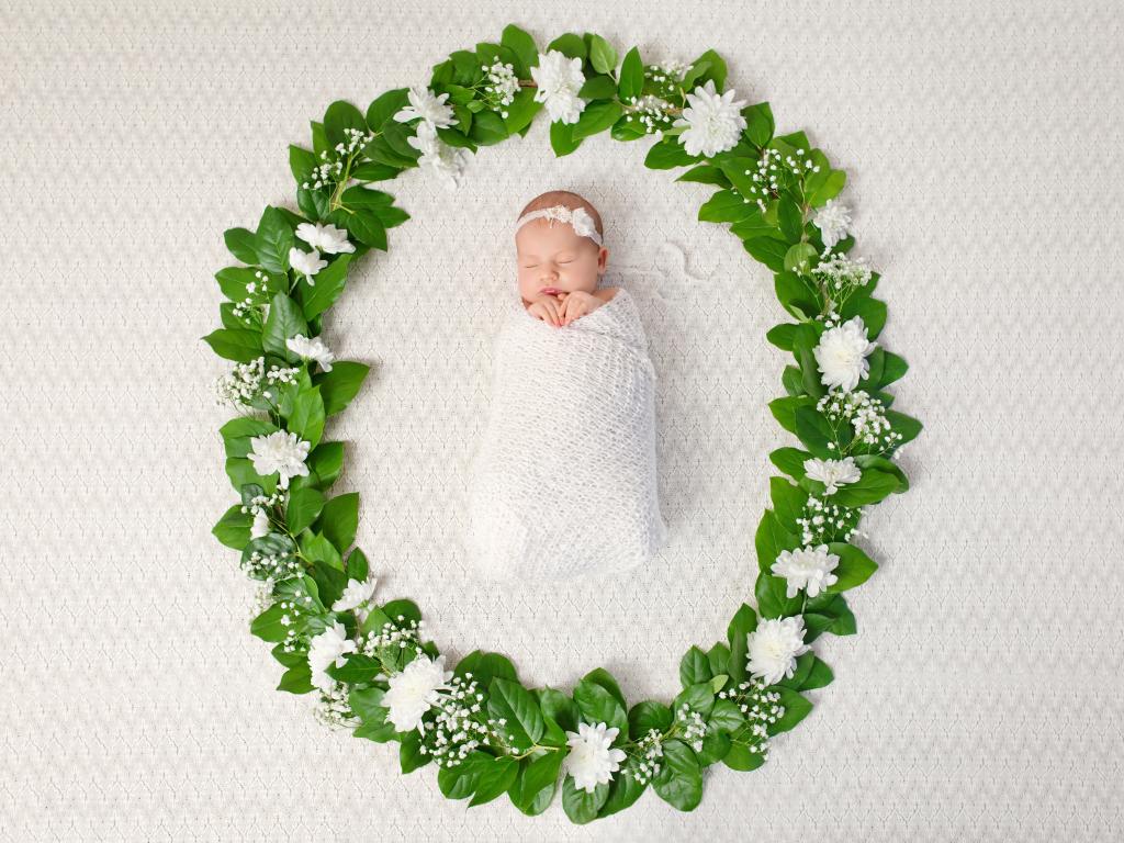 Wallpaper Small nursing baby sleeping in a green wreath of leaves