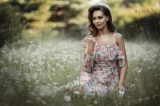 Wallpaper Little girl in a sundress sits on the grass