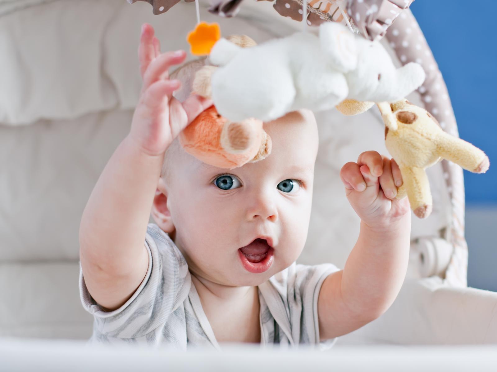 Wallpaper Small nursing baby in a stroller with toys