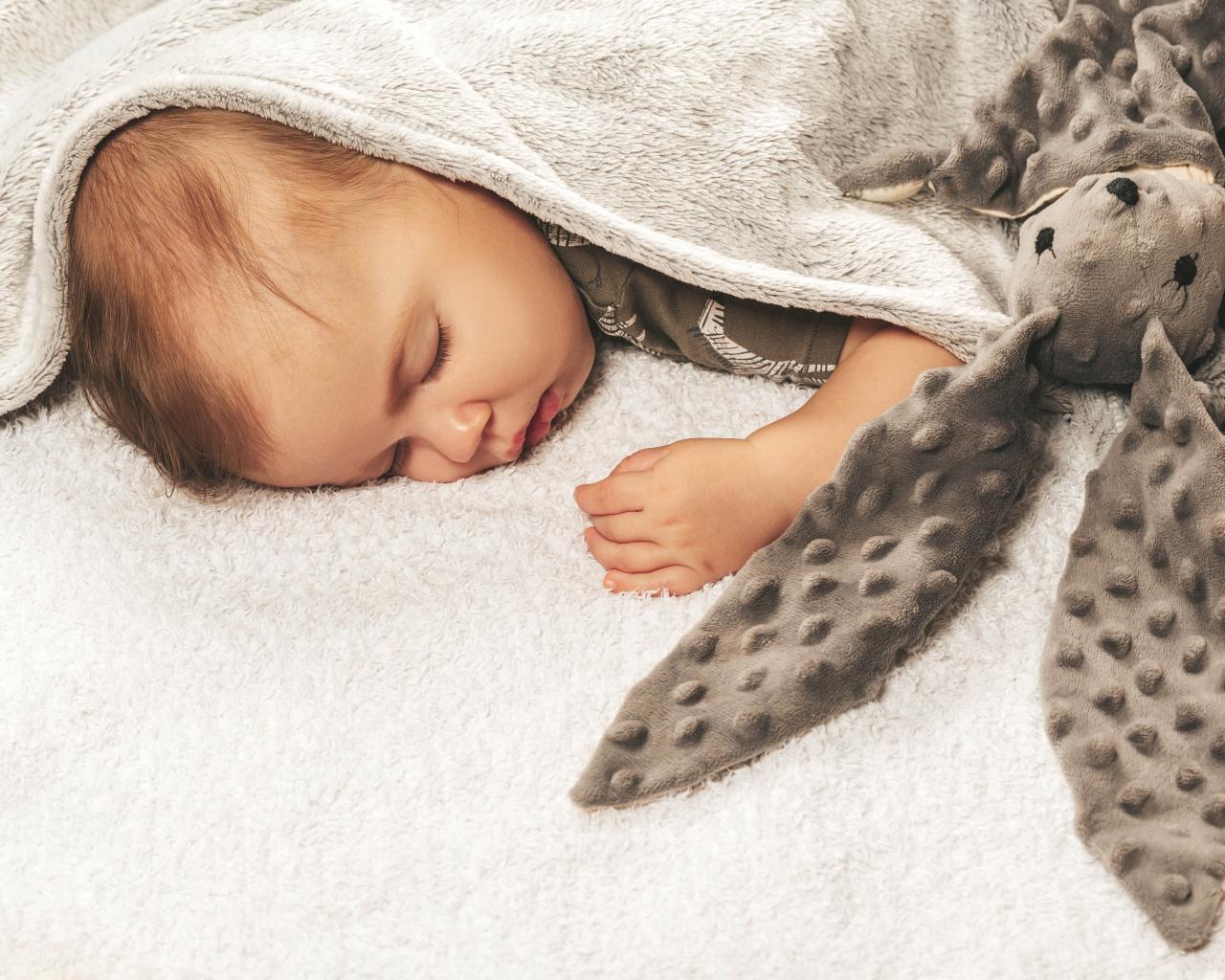 Wallpaper Little baby sleeping with a toy under a blanket