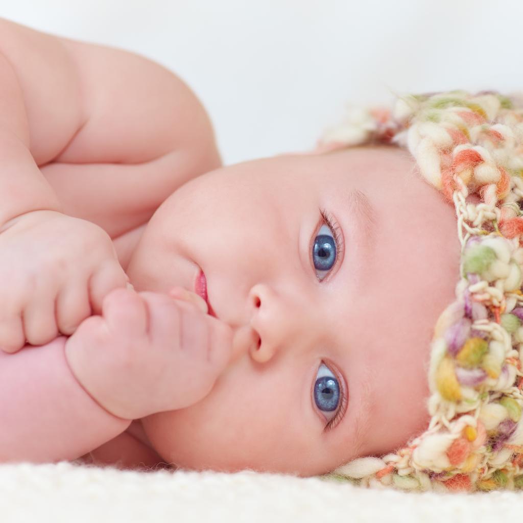 Wallpaper Blue-eyed baby in a white knitted hat with ears