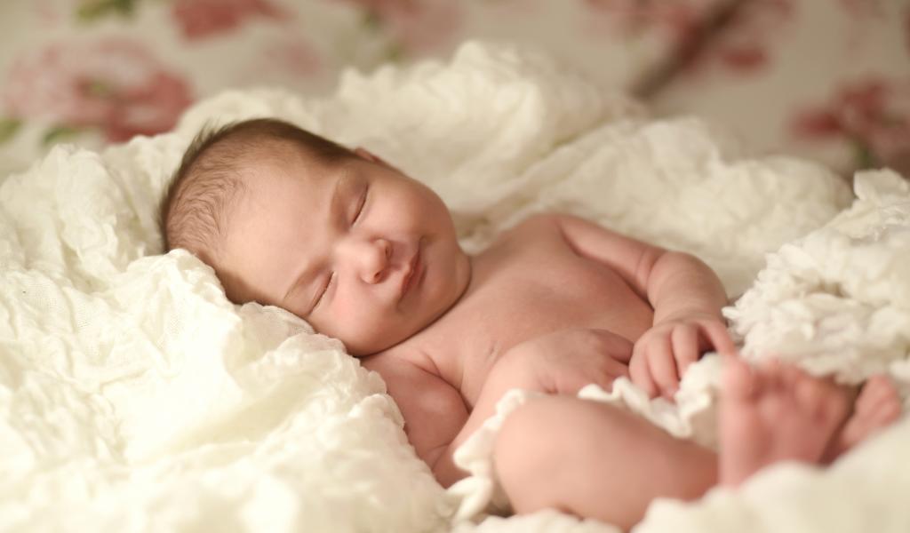 Wallpaper Cute nursing baby sleeping on a white bedspread
