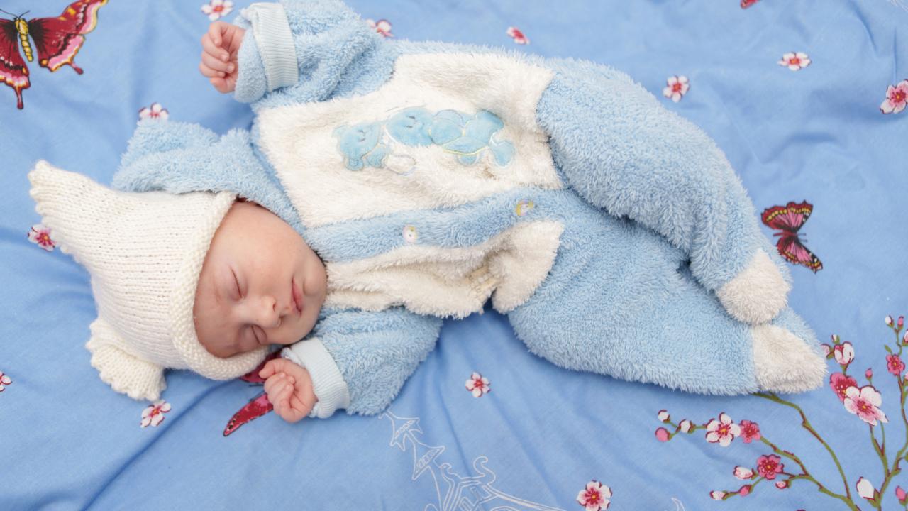 Wallpaper A baby in a blue suit lies on the bed