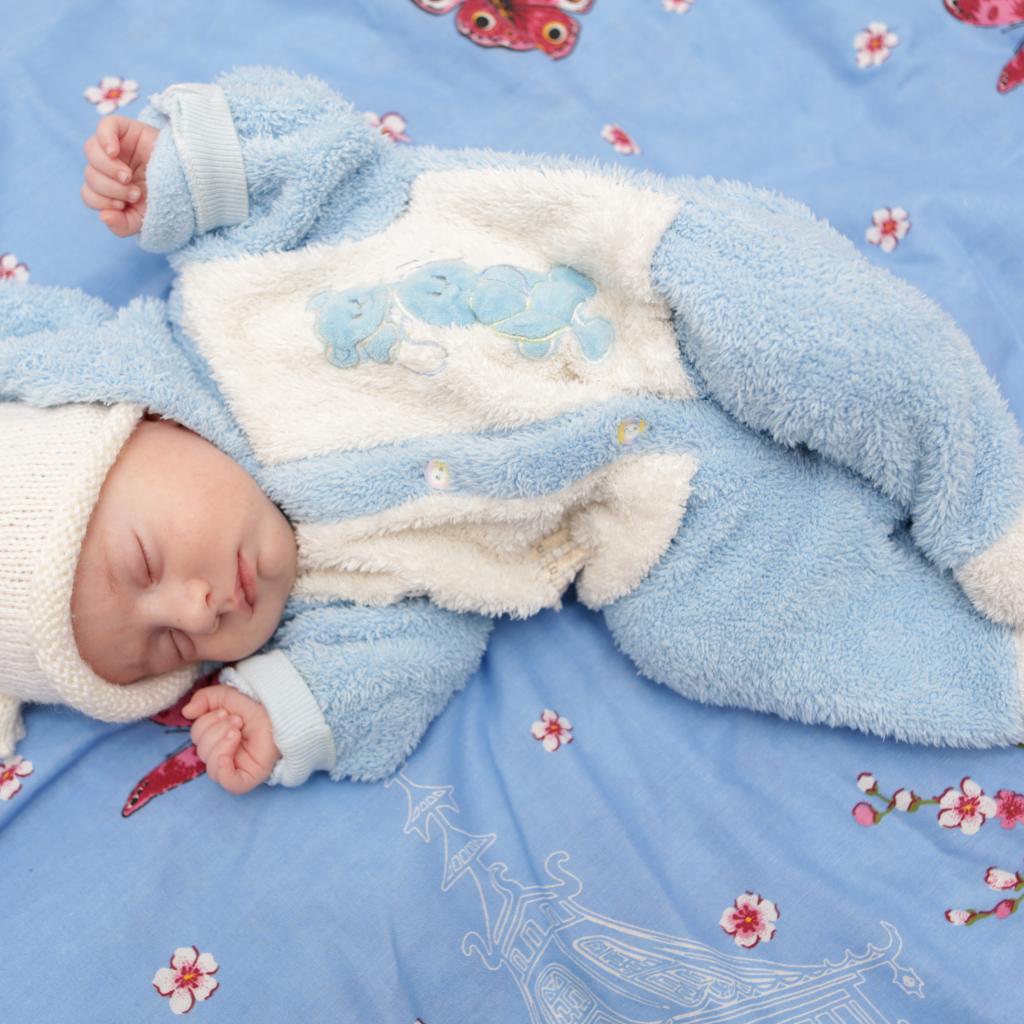 Wallpaper A baby in a blue suit lies on the bed