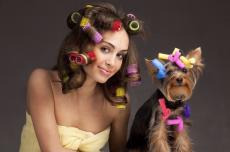 Wallpaper Girl with curlers on her head with a dog