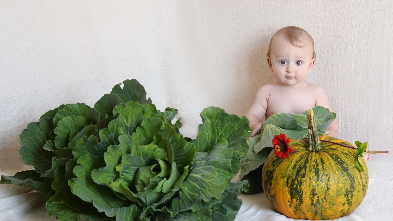 Wallpaper Little child with pumpkin and cabbage near the wall