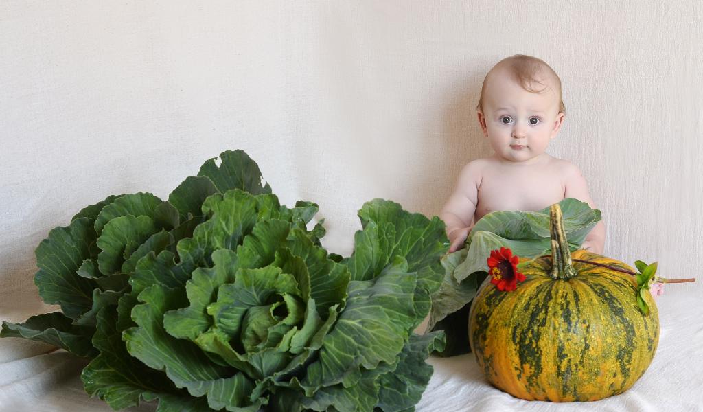Wallpaper Little child with pumpkin and cabbage near the wall