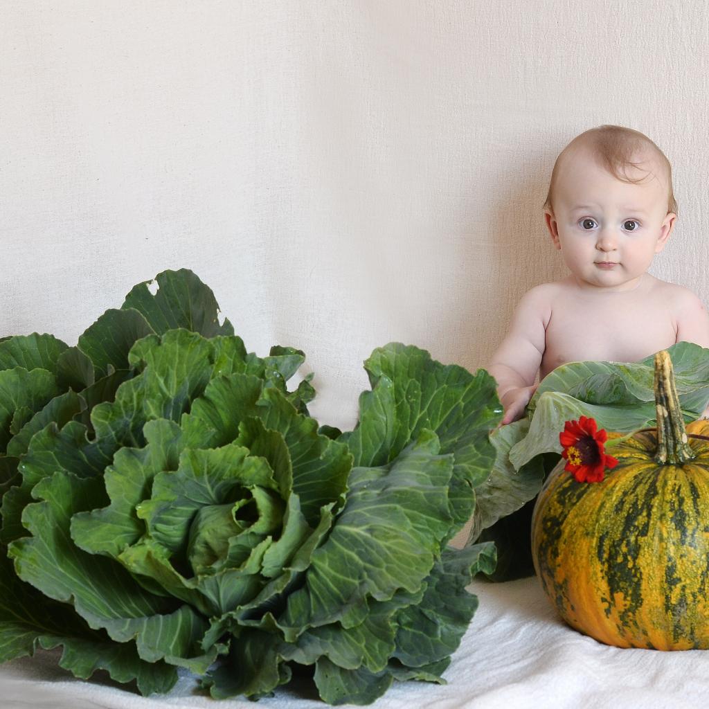 Wallpaper Little child with pumpkin and cabbage near the wall