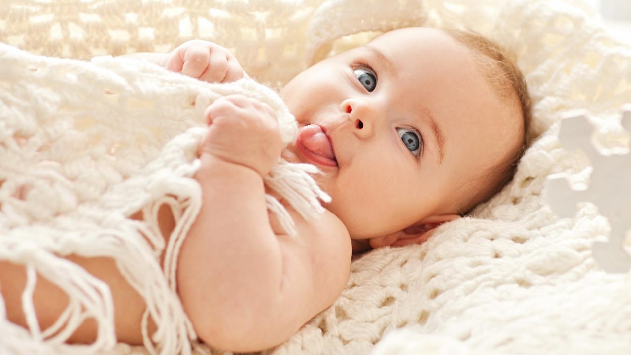 Wallpaper A happy dog with his tongue hanging out lies on a white bed