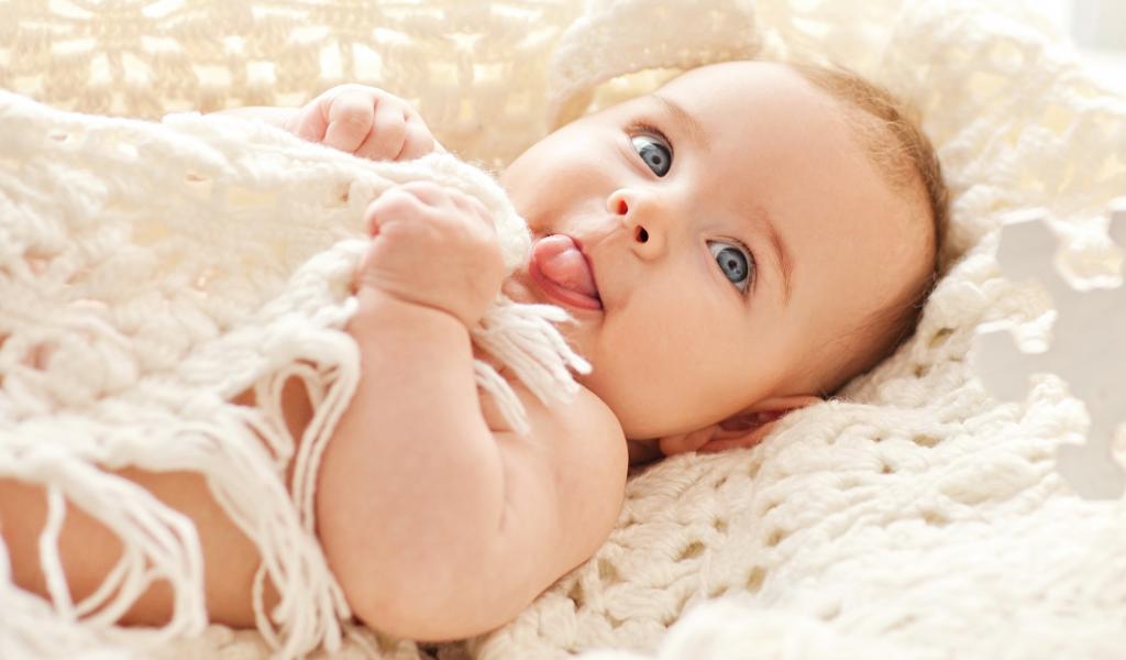 Wallpaper A happy dog with his tongue hanging out lies on a white bed