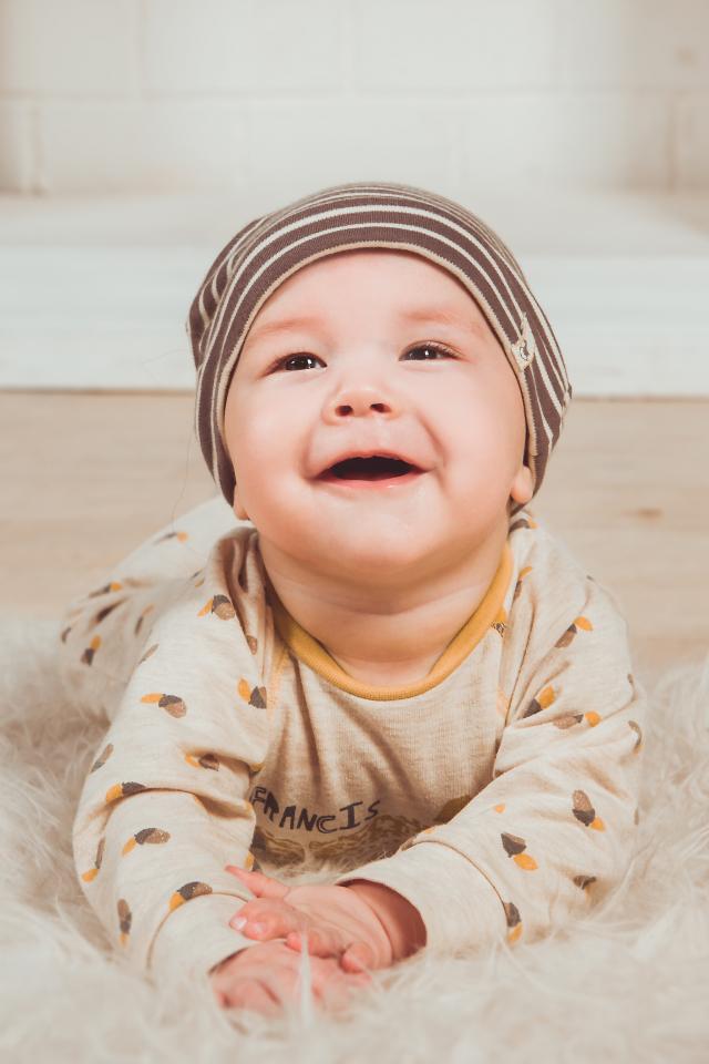 Wallpaper Smiling breastfeeding baby wearing a hat on the floor