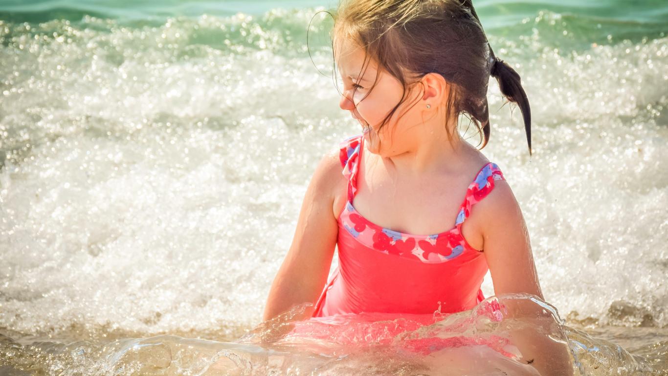 » Wallpaper Cheerful little girl in a swimsuit sits in the water