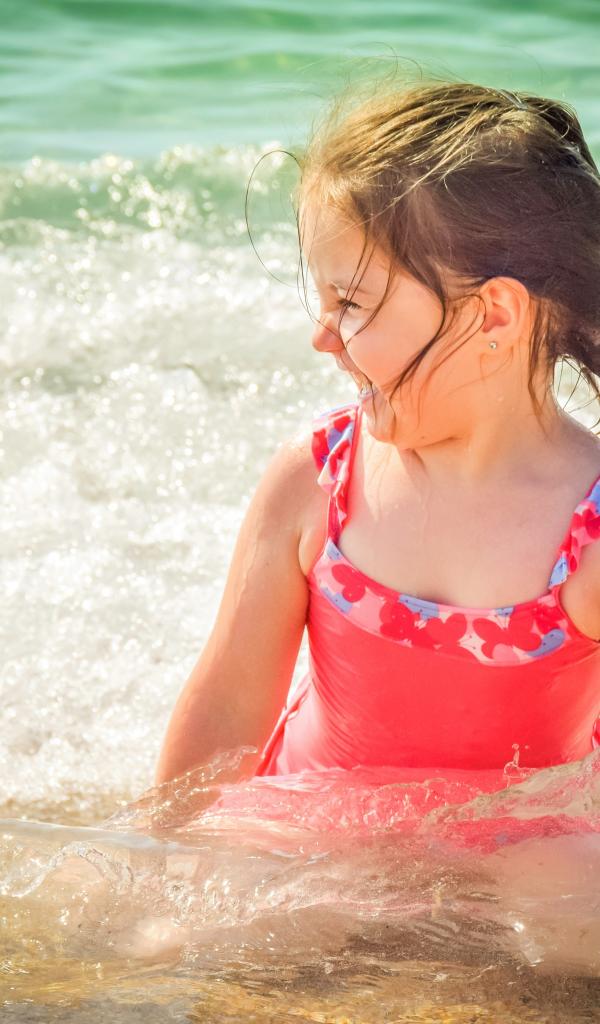 Wallpaper Cheerful little girl in a swimsuit sits in the water