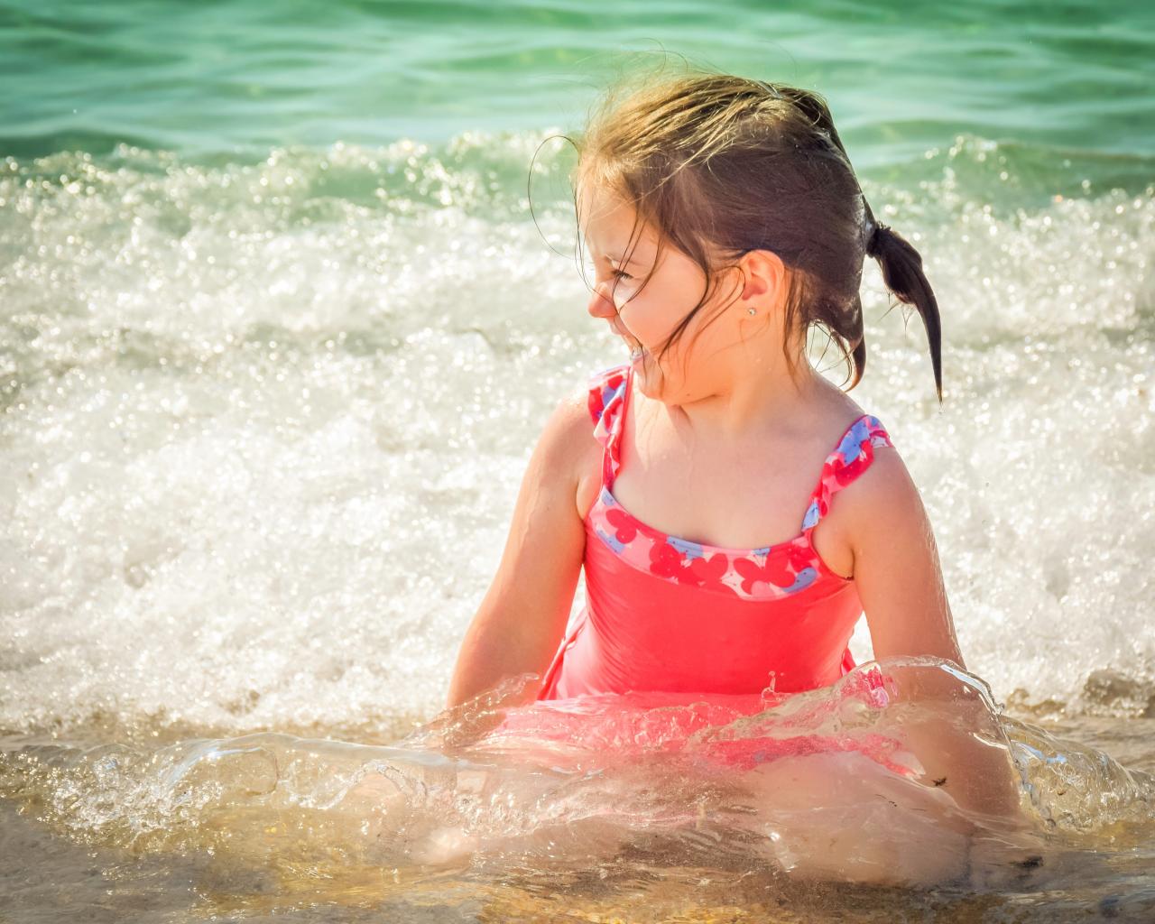 » Wallpaper Cheerful little girl in a swimsuit sits in the water