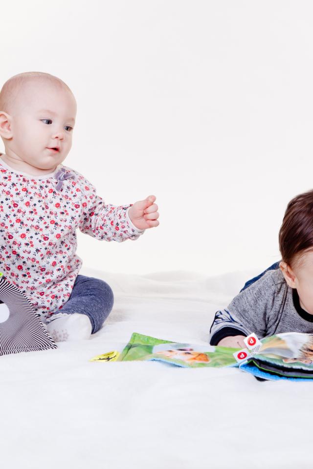 Wallpaper Two little children playing on a white background