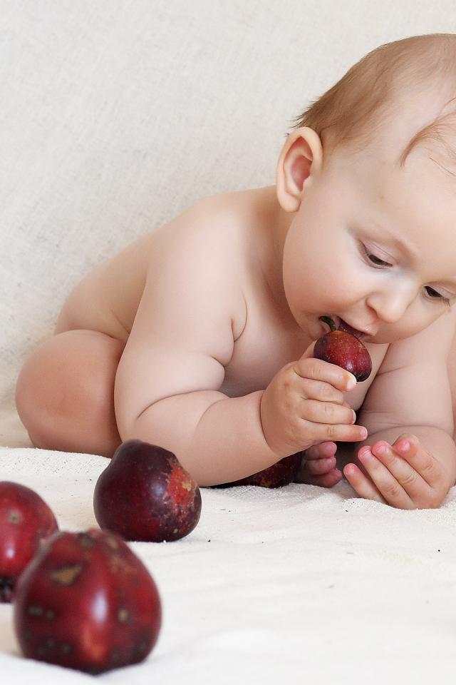 Wallpaper Small breastfeeding baby gnawing red apples