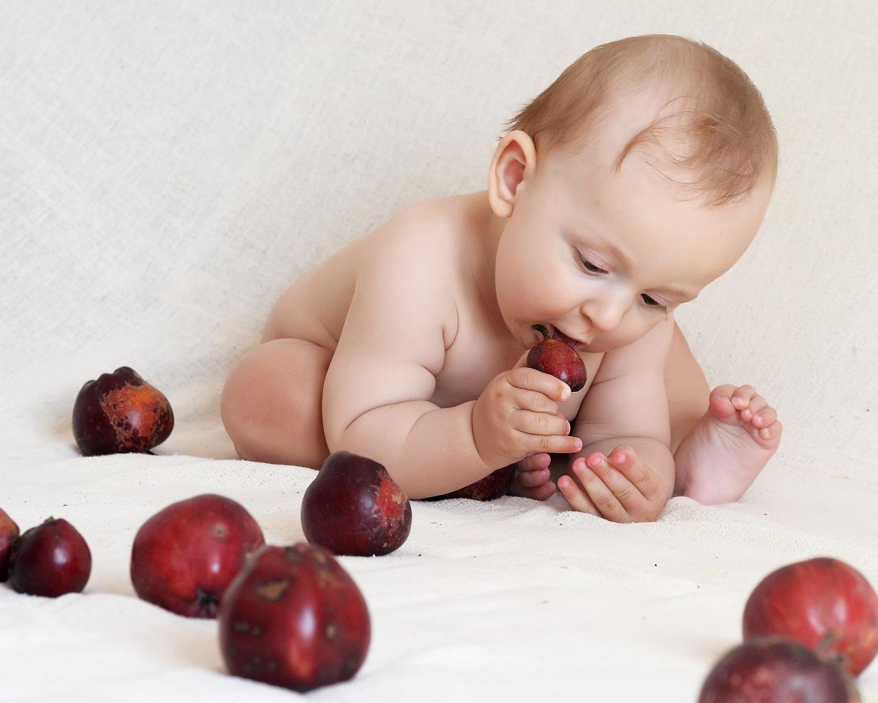 Wallpaper Small breastfeeding baby gnawing red apples