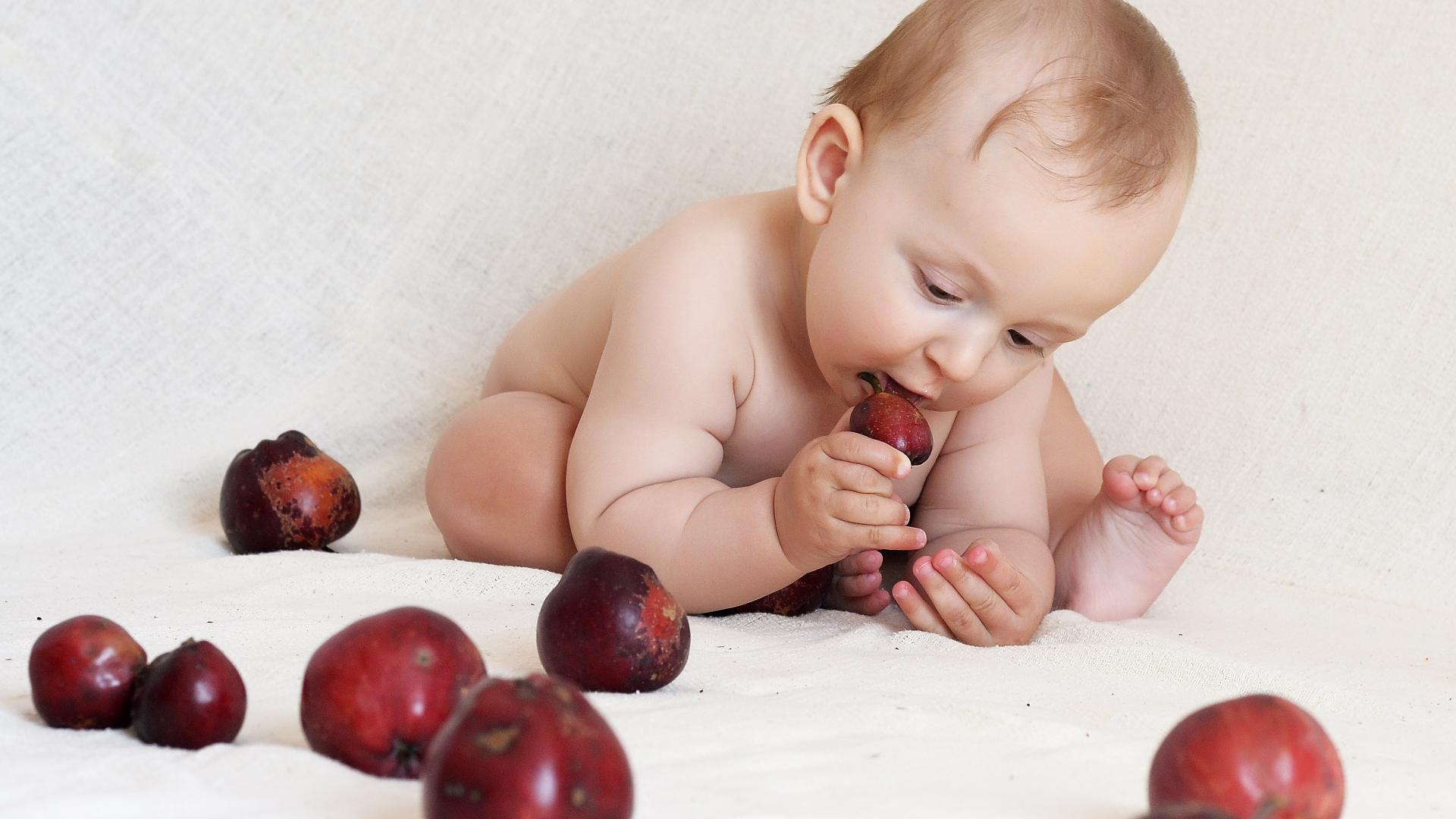 Wallpaper Small breastfeeding baby gnawing red apples