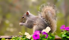 Wallpaper Little boy sits near red petunia flowers